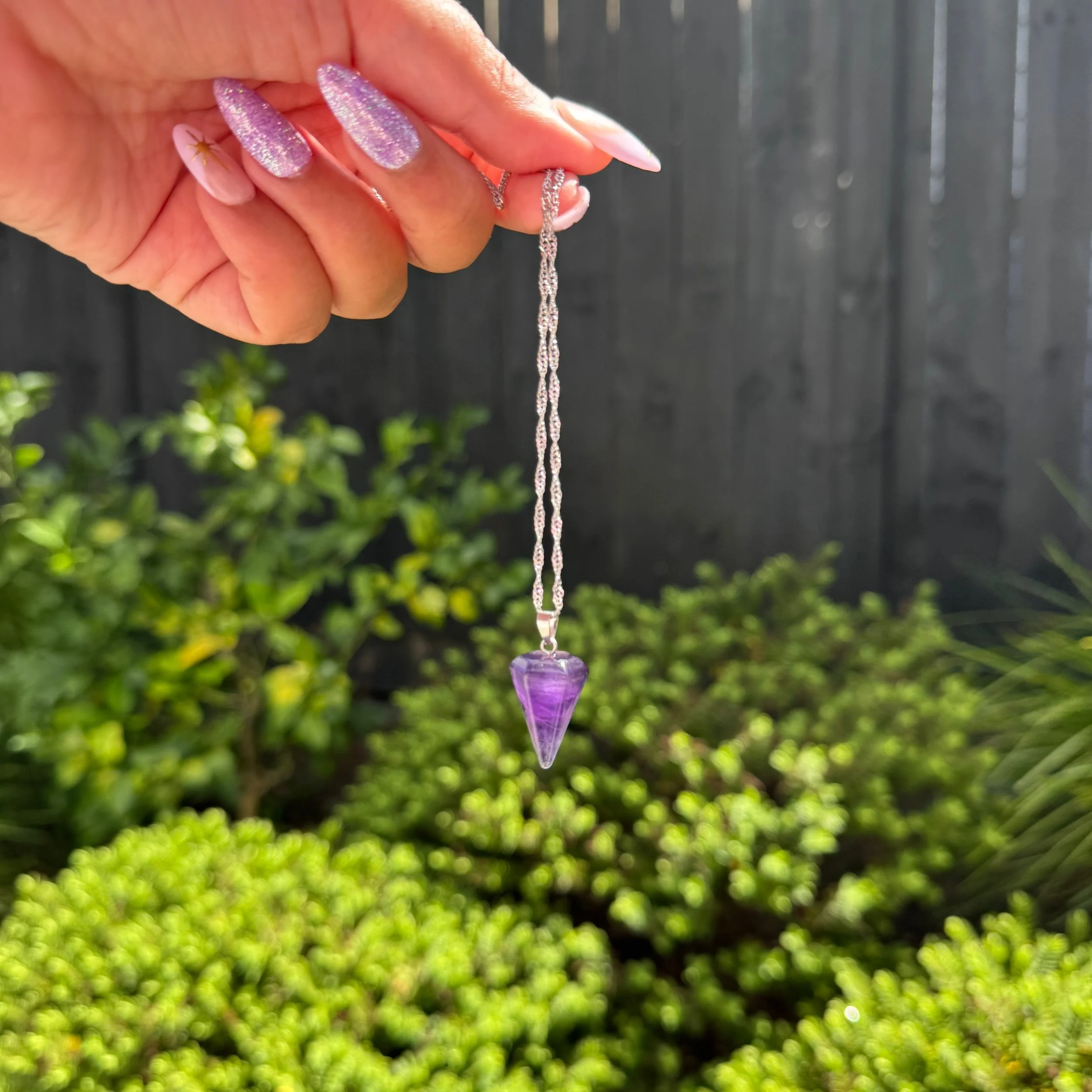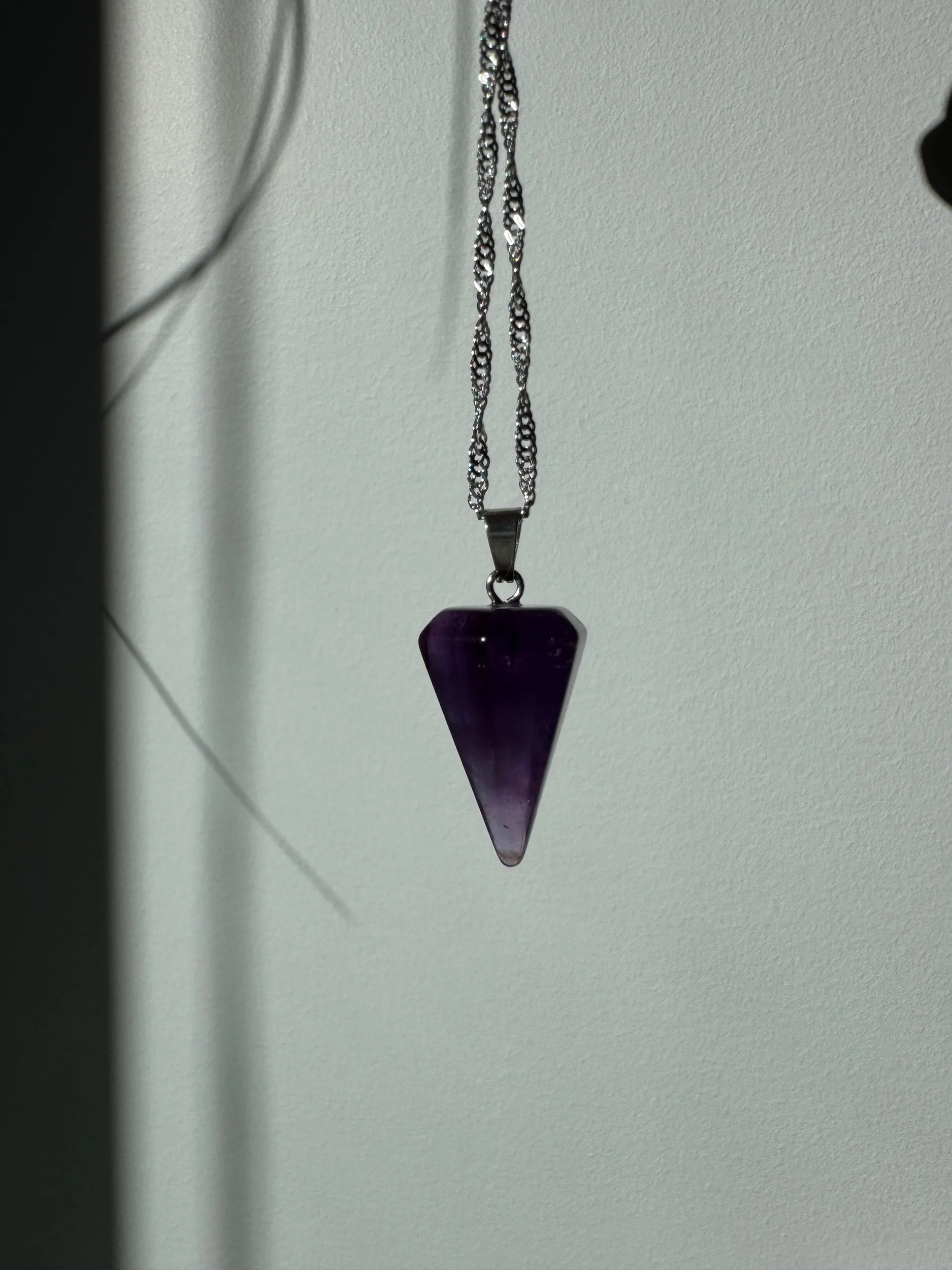 The Amethyst Pendulum Necklace features a polished amethyst crystal pendulum, long associated with intuition, clarity, and spiritual guidance. Whether you use pendulums for divination or simply love the energy of crystals, this piece is a beautiful reminder to trust your inner knowing.